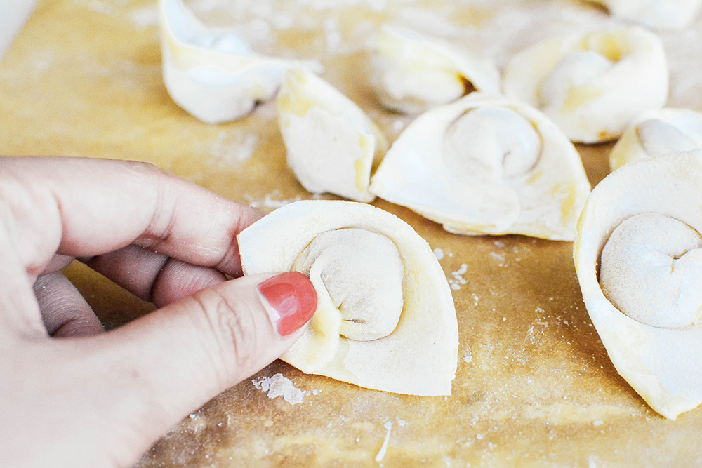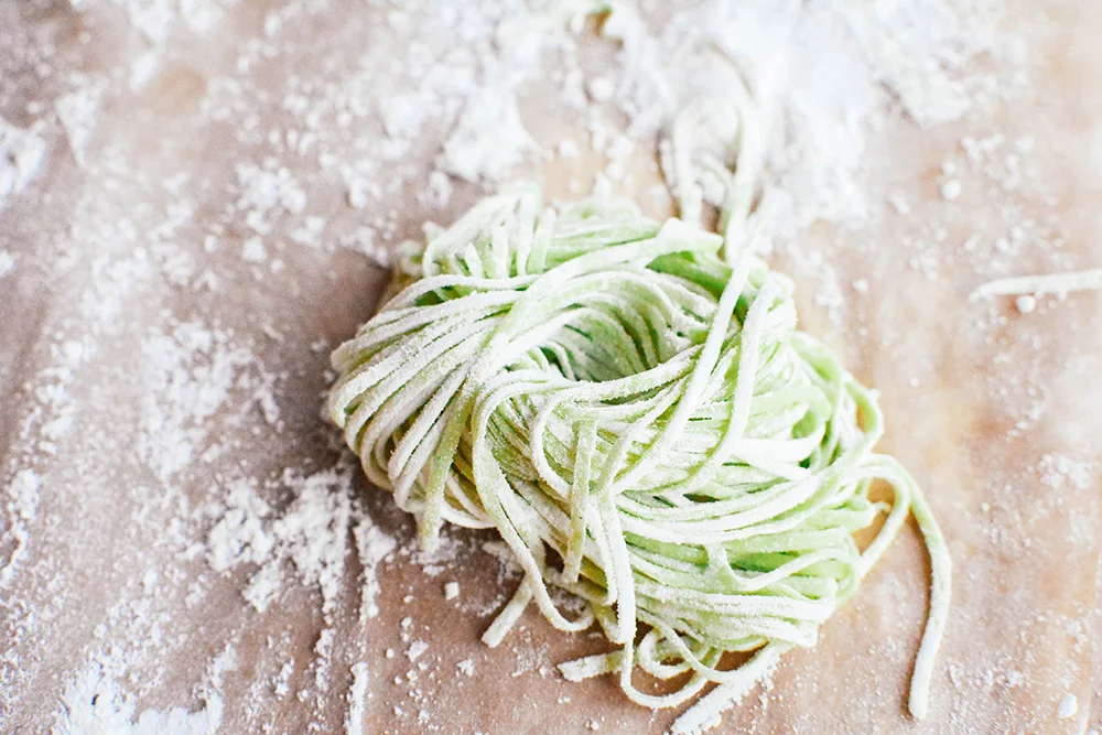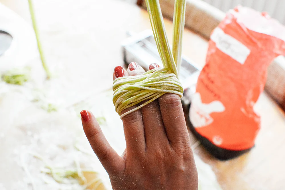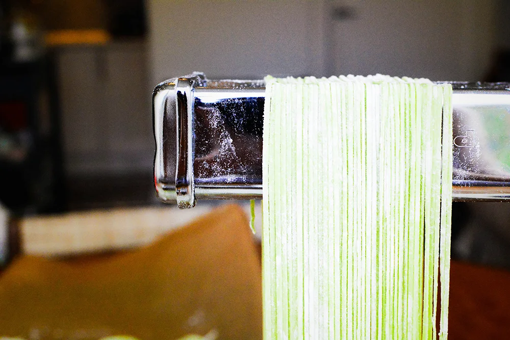 Roll out dough into a rectangle, fold it into thirds and then cut it into thin noodles (or use a pasta making machine like me).