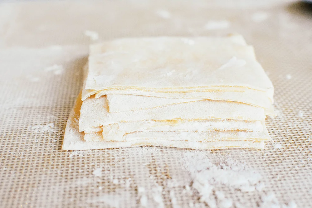 All you have to do is roll out the dough into a big thin sheet (1 mm thick) and cut them into 3x3 squares.