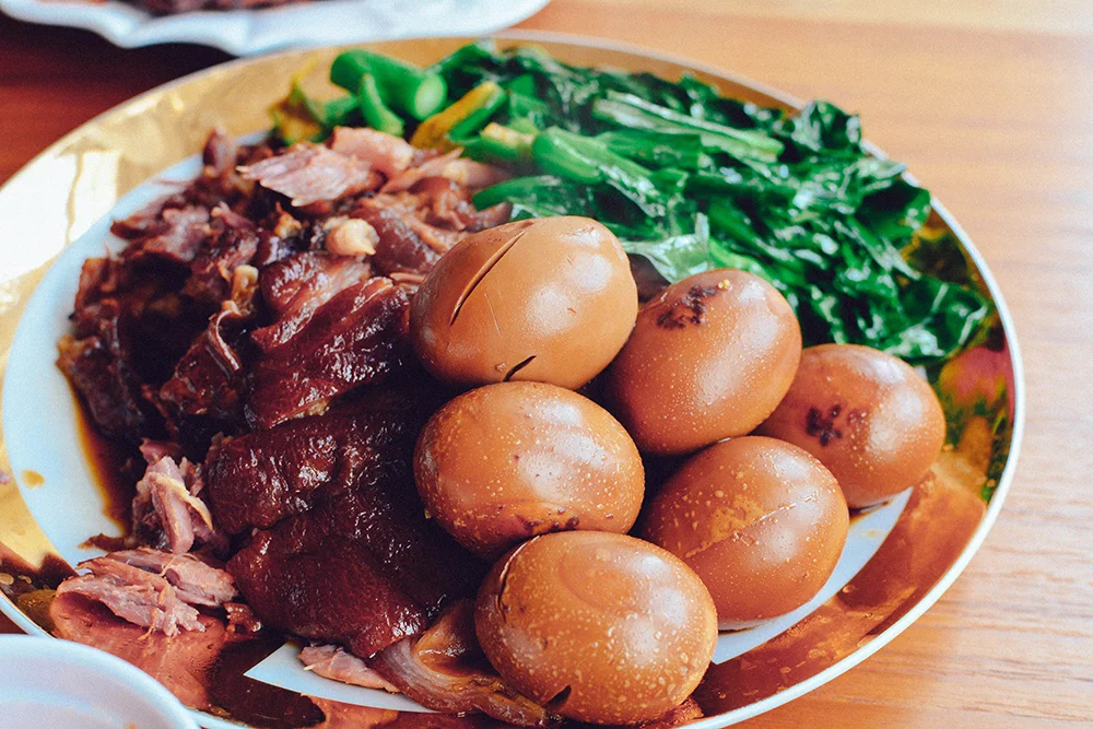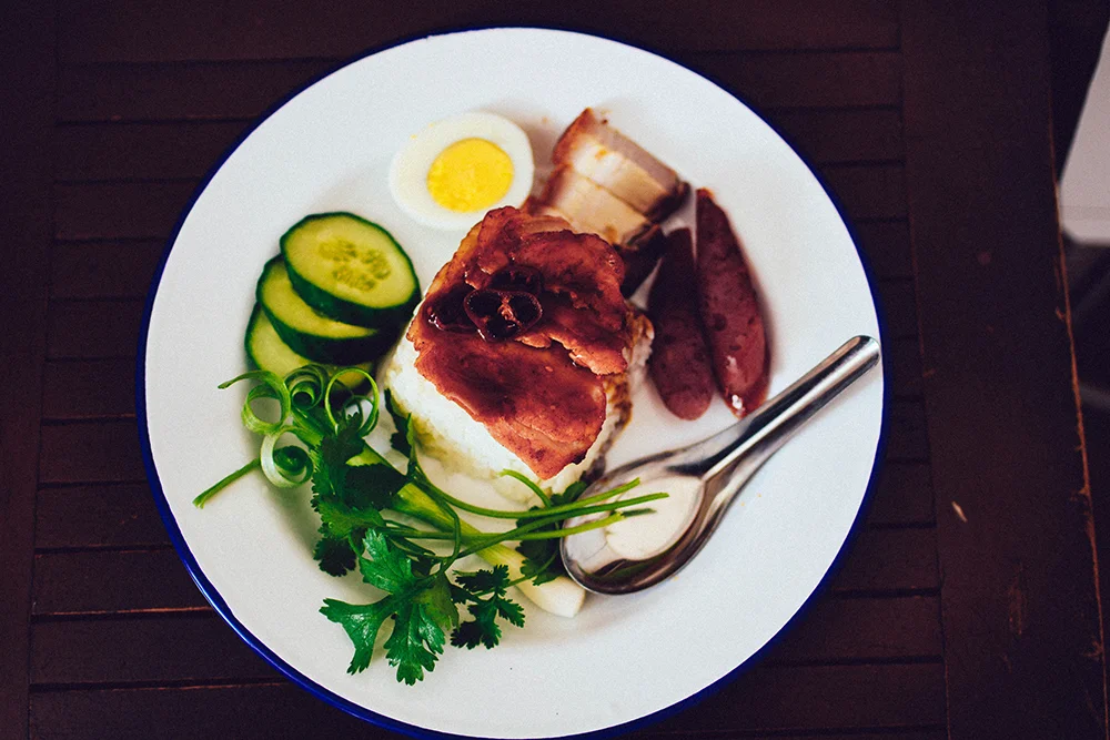 P'Arm came to my house with two big bags of ingredients and his own special pots and pans. He made two dishes, typically found on the streets of Thailand - Koa moo dang (Barbecued red pork in sauce with rice) and Koa kha moo (stewed pork leg).